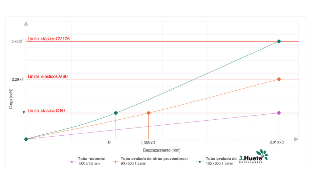 Con la misma carga, el tubo ovalado de J. Huete Greenhouses tiene una flecha 2,816 veces inferior a la del tubo redondo, y 1,365 veces inferior a la del tubo ovalado de otras marcas.